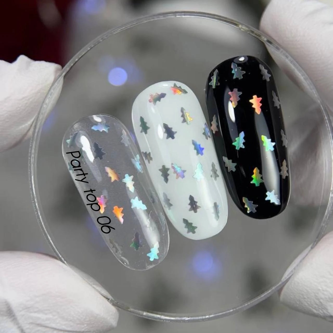 NAILSOFTHEDAY Party Top 06 — a holographic top coat with festive tree-shaped glitter, no sticky layer, 10 ml.